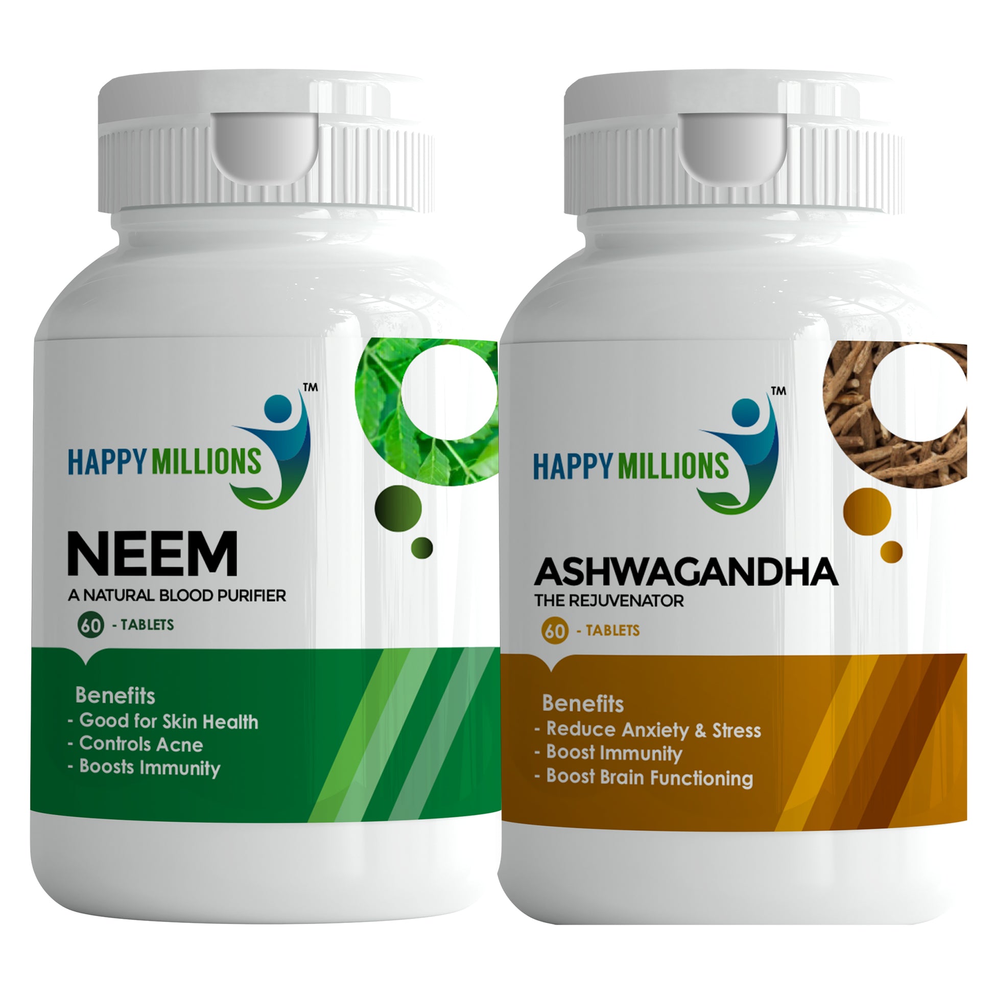 HappyMillions Neem & Ashwagandha Combo | Ayurvedic Immune & Stress Support | 60+60 Tablets