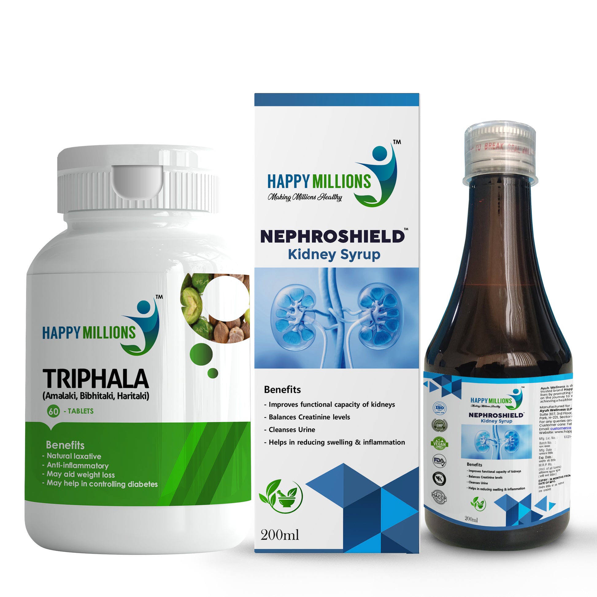 HappyMillions Triphala Tablets & Nephroshield Syrup Combo | Digestive & Kidney Health Support | Natural Detox & Urinary Wellness | 60 Tablets & 200ml Syrup