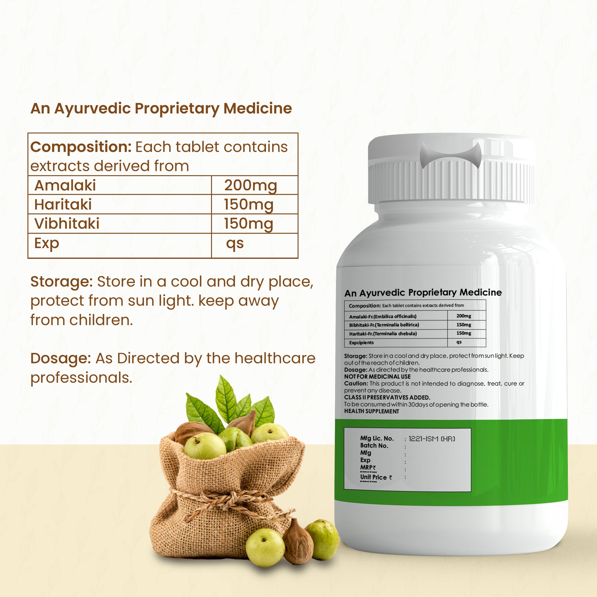 Digestive Health: Triphala Tablets aid in digestion, detoxification, and regular bowel movements.