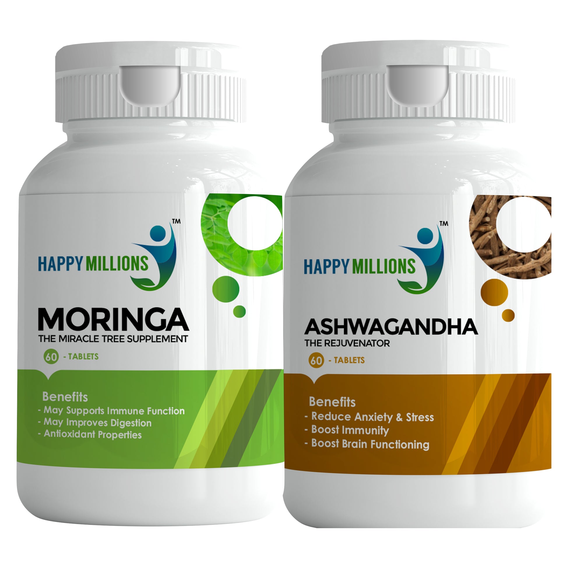 HappyMillions Moringa & Ashwagandha Tablets Combo | 60 + 60 Tablets | Ayurvedic Immune Support, Energy Boost, Stress Relief & Overall Wellness