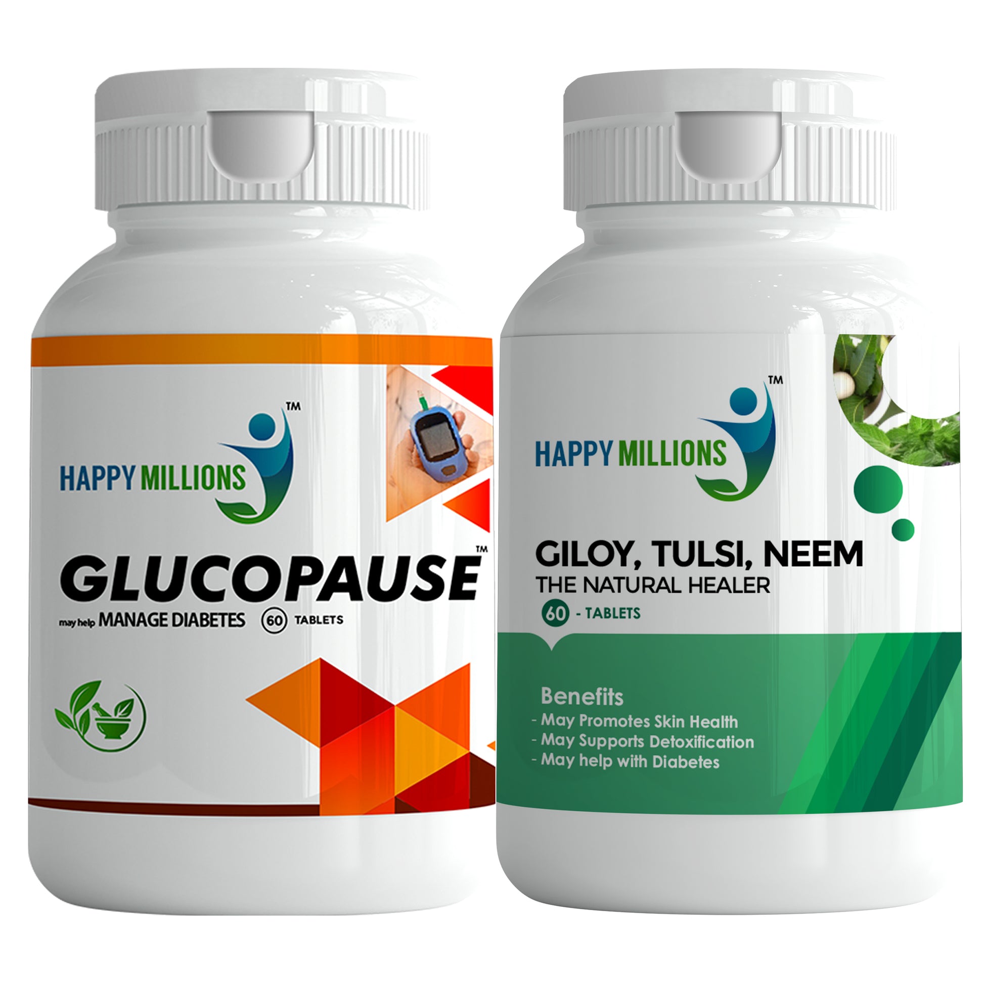 HappyMillions GlucoPause & Giloy Tulsi Neem Combo | Natural Diabetes & Immunity Support | Regulates Blood Sugar & Boosts Immunity | 60 Tablets + 60 Tablets