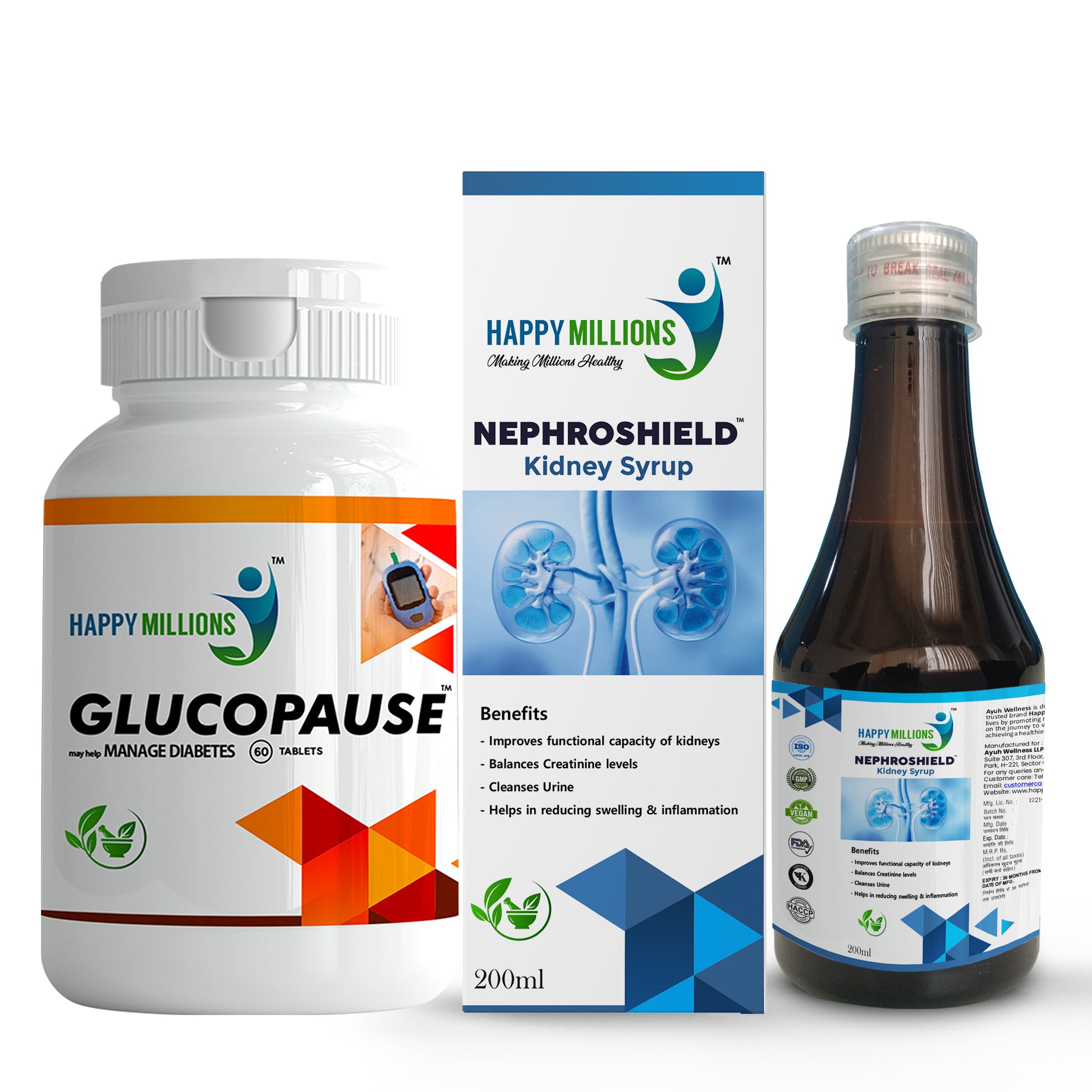 HappyMillions GlucoPause Tablets & NephroShield Syrup Combo | Blood Sugar Regulation & Kidney Health Support | 60 Tablets + 200ml Syrup