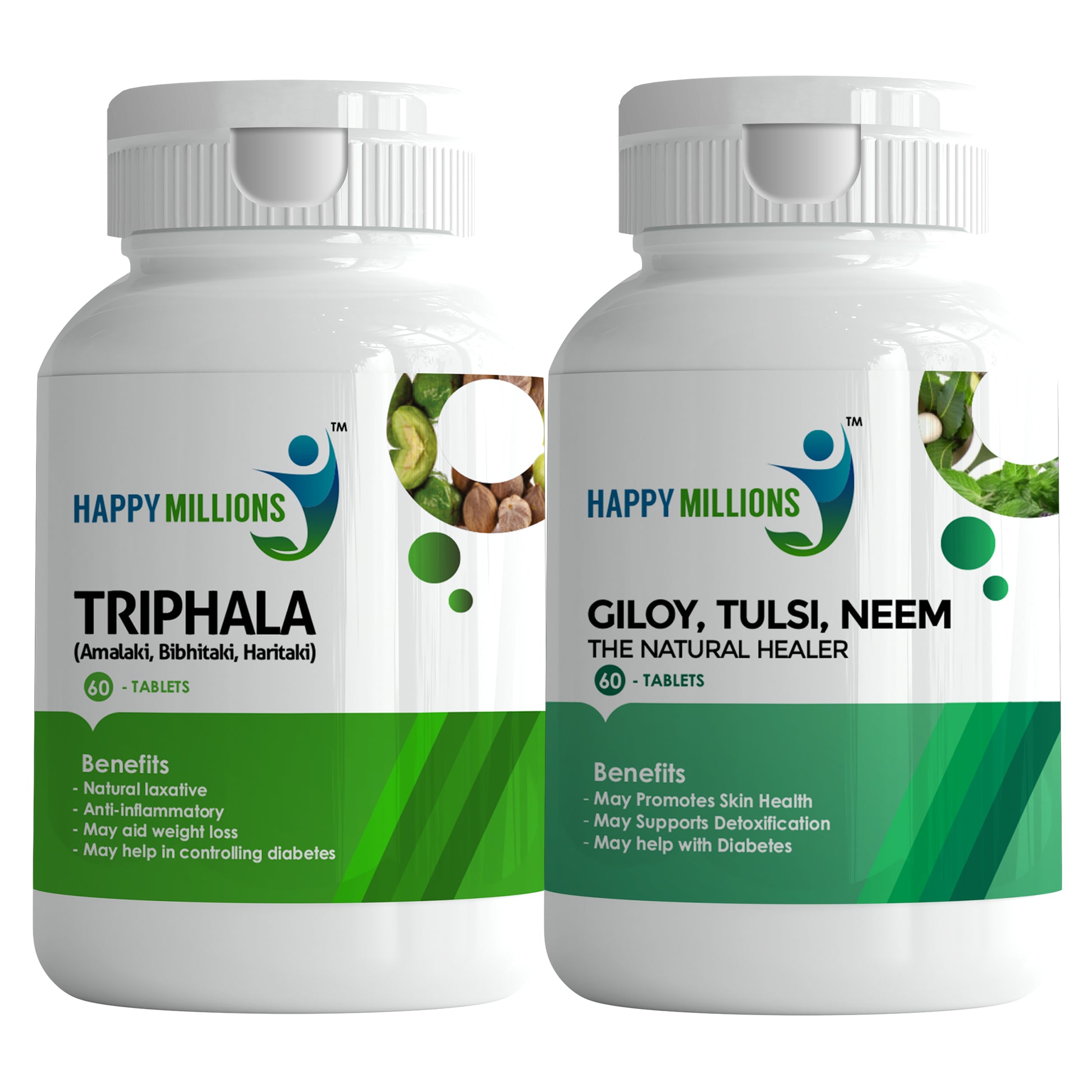 HappyMillions Triphala Tablets & Giloy Tulsi Neem Tablets Combo | Ayurvedic Detox, Immunity & Digestive Health Support | 60 Tablets Each