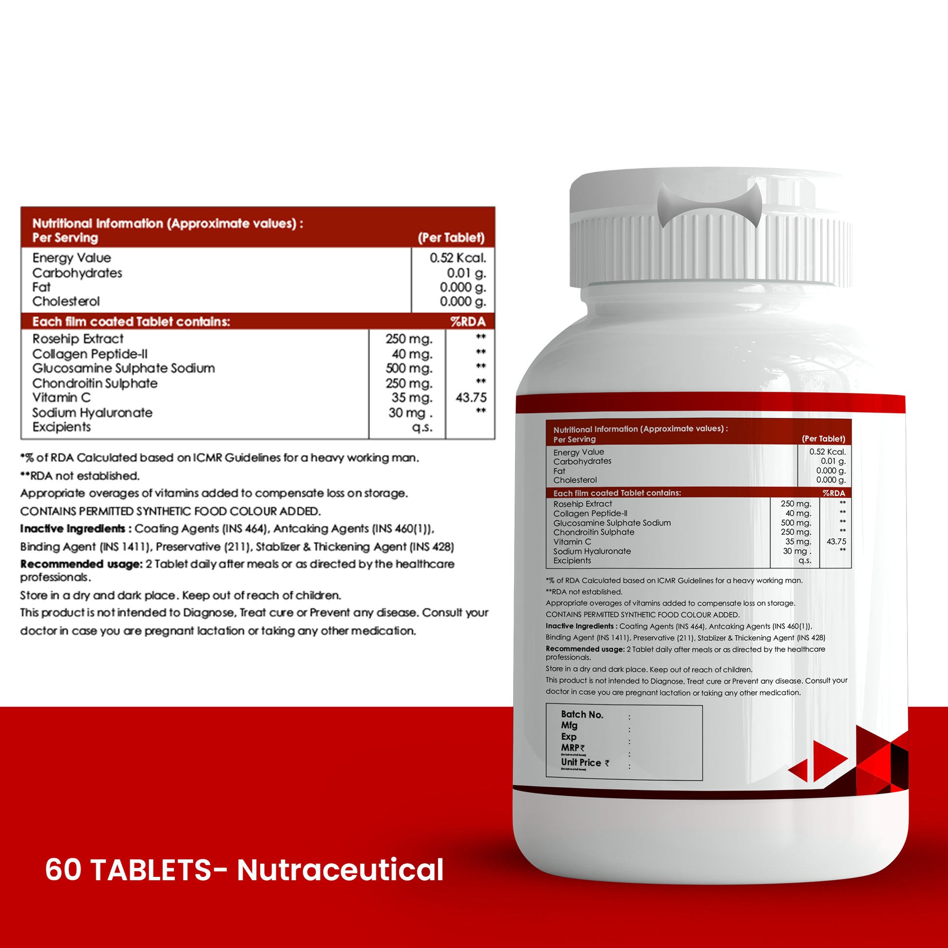 Ingredients :Glucosamine hydrochloride 500mg, Cissus quadrangularis 100mg, Zingiber officinale 50mg, Boswellia serrate 250mg Additives : Di Calcium phosphate 341(ii), Magnesium stearate (470(ii)), Talc (553(iii)), IPA, starch Contains permitted natural color.