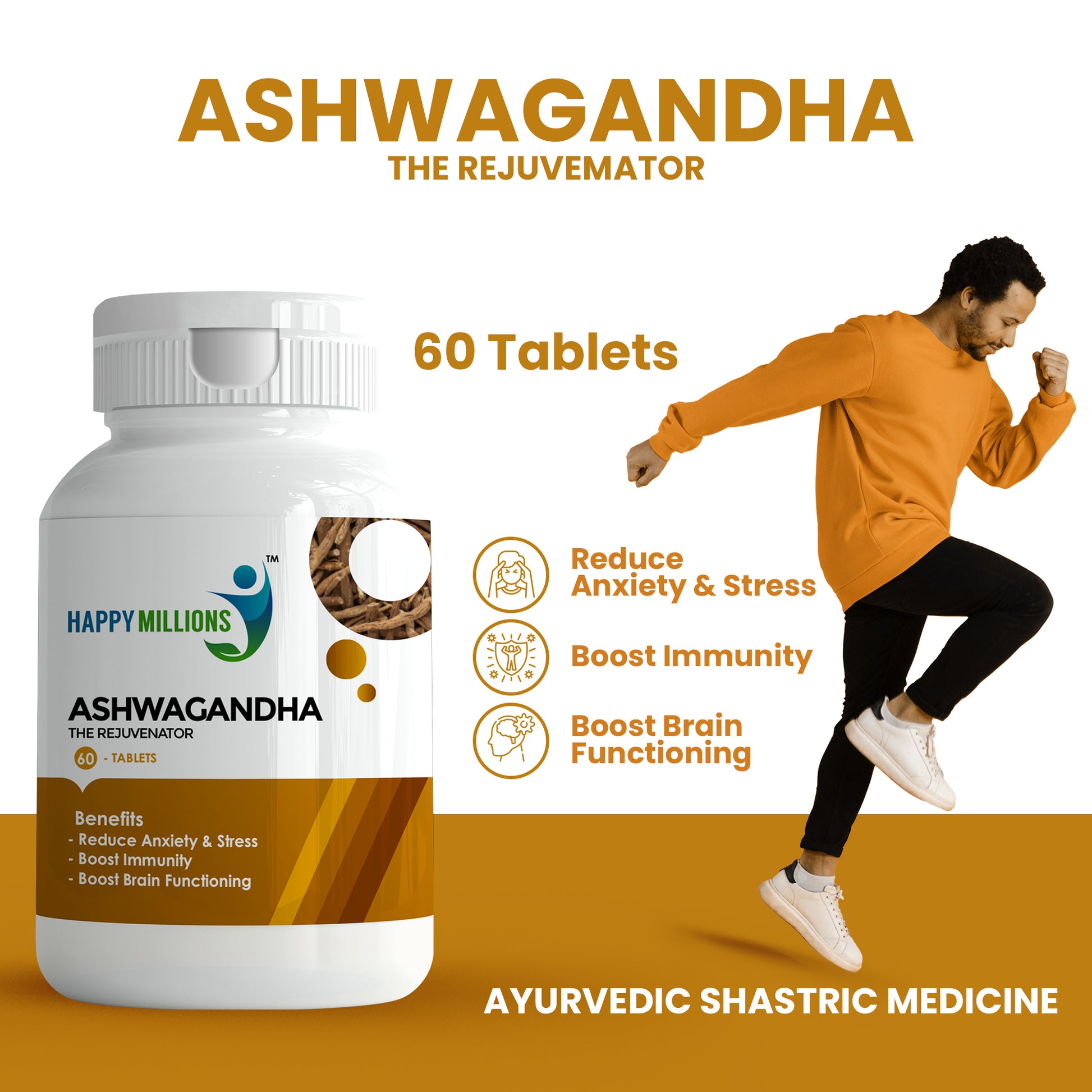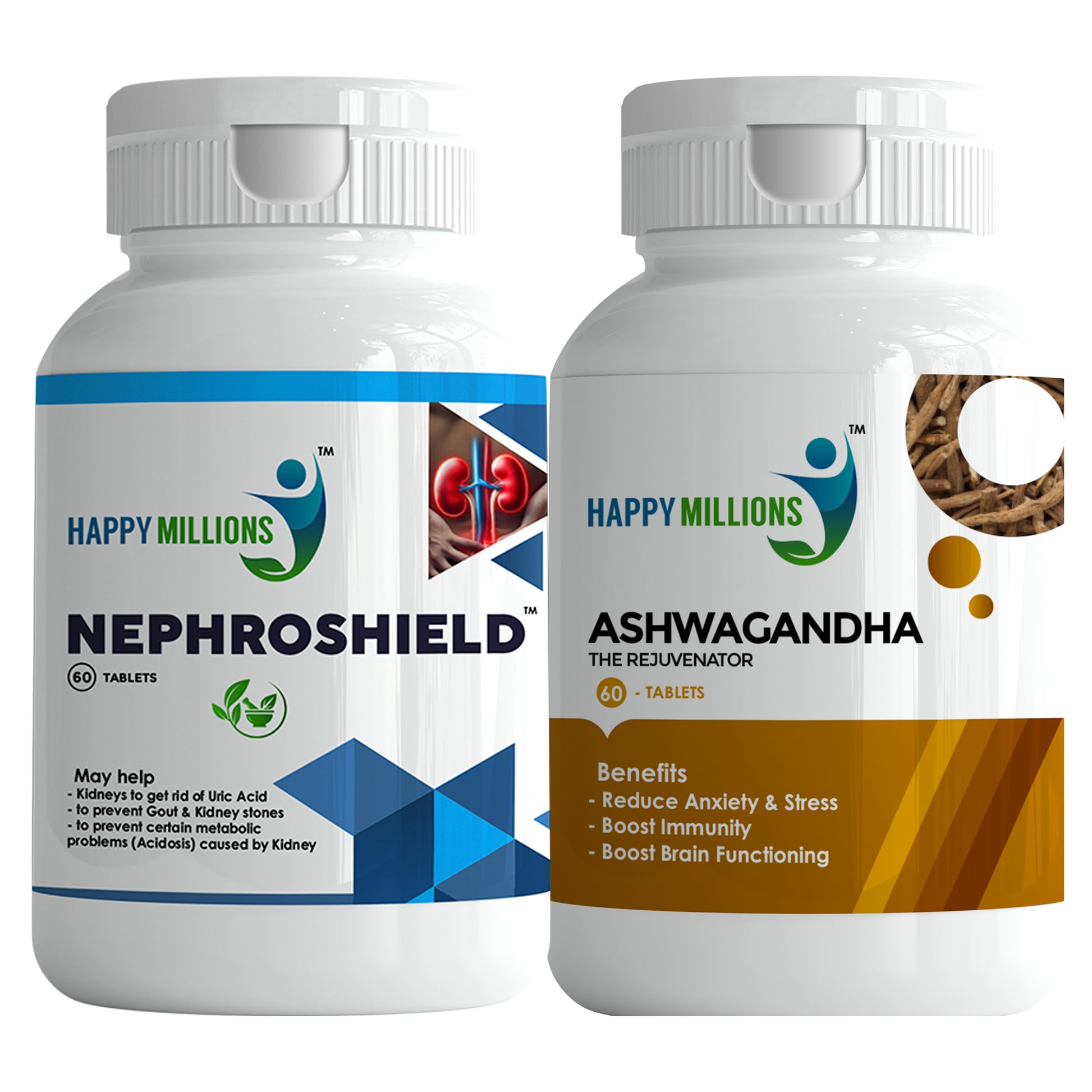 HappyMillions NephroShield & Ashwagandha Combo | Kidney Health & Stress Relief Support | Natural Ayurvedic Supplements for Detox & Well-Being | 60+60 Tablets