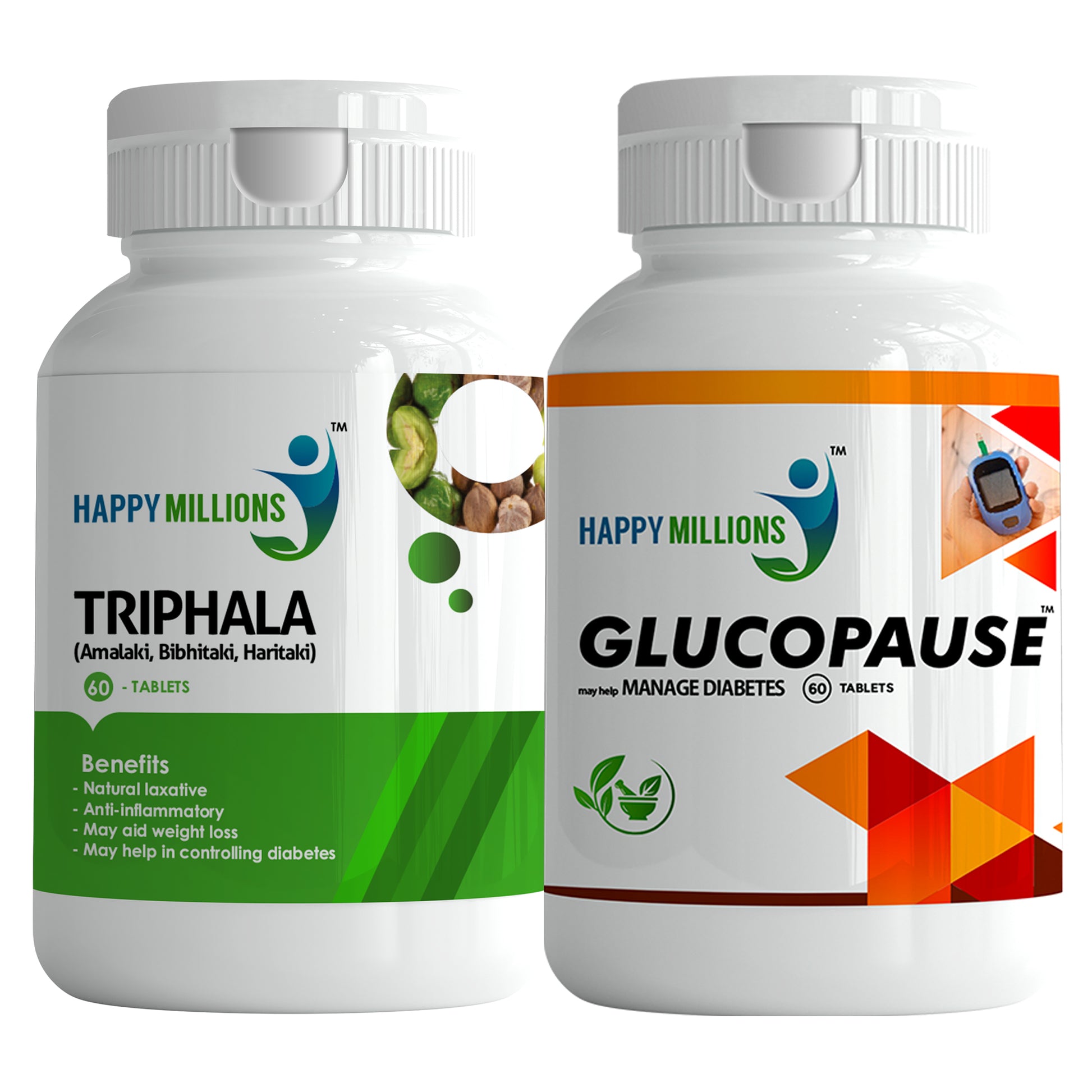 HappyMillions Triphala Tablets & Glucopause Tablets Combo | 60 Tablets Each | Digestive Health & Blood Sugar Support | Ayurvedic Herbal Supplement