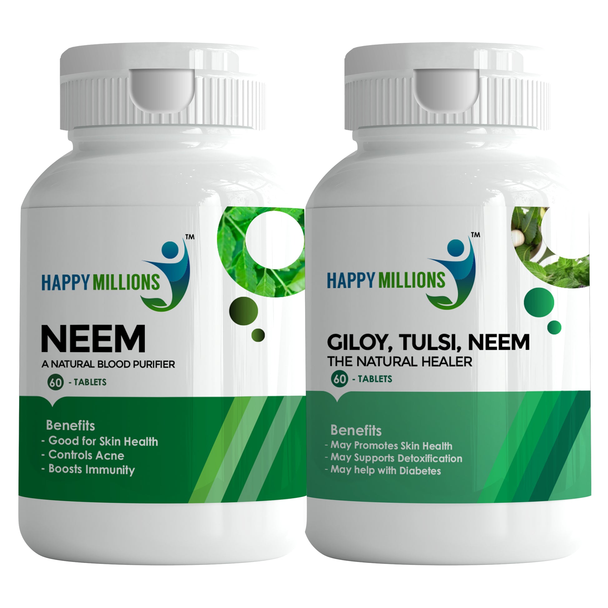 HappyMillions Neem Tablets & Giloy Tulsi Neem Tablets Combo | Ayurvedic Immunity & Detox Support | Natural Skin Care & Wellness Supplement | 60+60 Tablets
