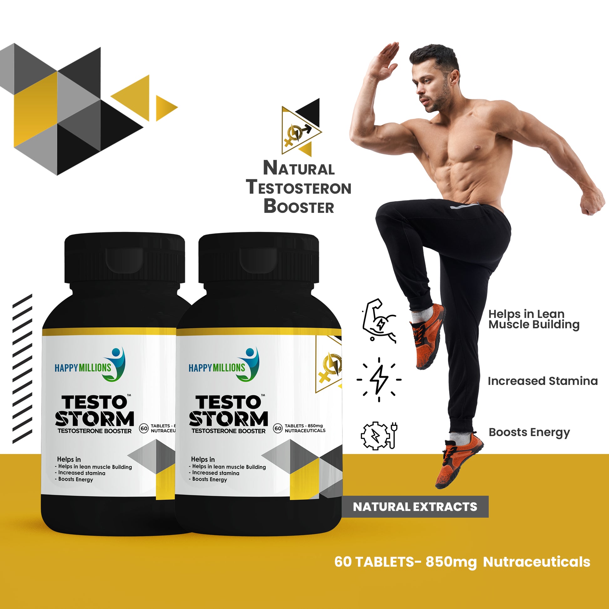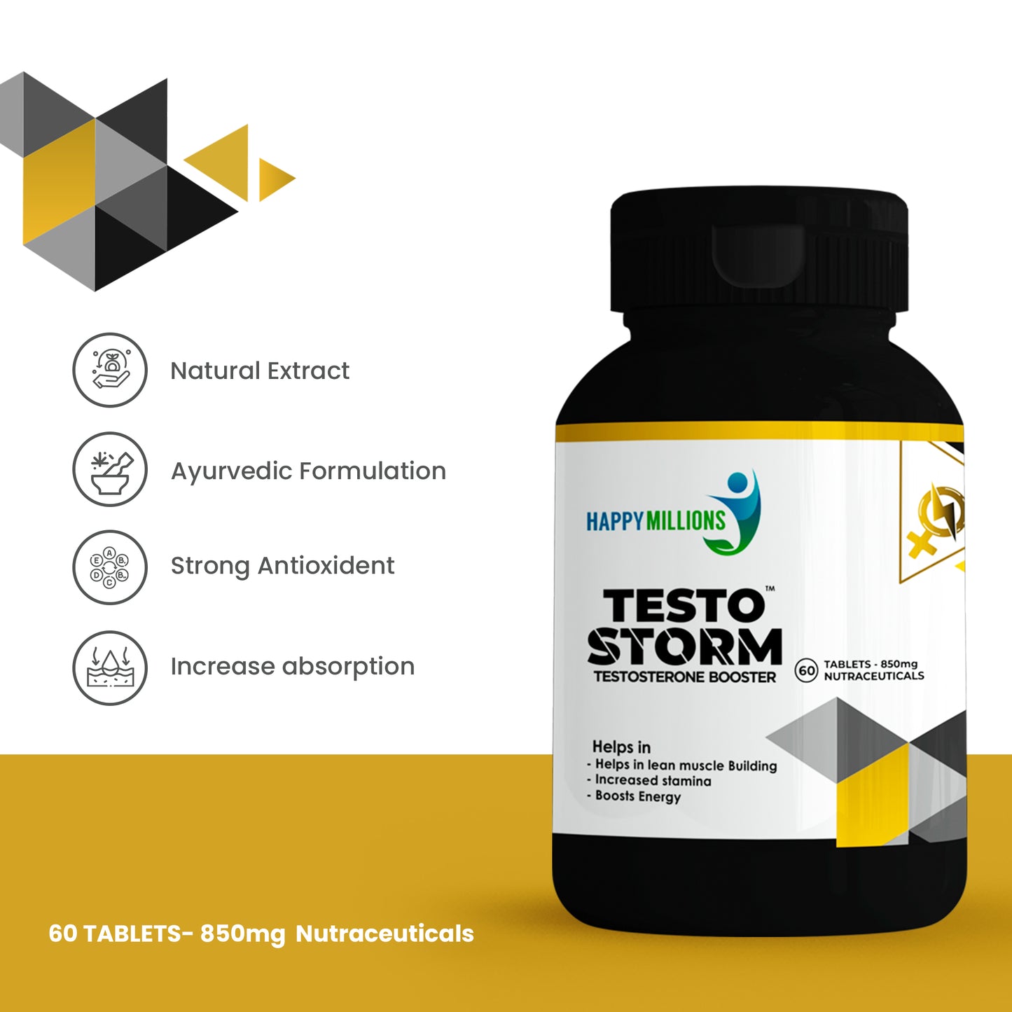 Happy Millions TestoStorm is a natural supplement designed to help increase testosterone levels and power. It contains a powerful blend of herbs and extracts, including Withania somnifera 100mg, Anacyclus pyrethrum 50mg, Mucuna pruriens 150mg, Tribulus terresris 100mg, Asparagus densiflorus 50mg, Ginkgo biloba extract 150mg, Chlorophytum borivillianum 100mg, Hygrophila auriculata 100mg. These ingredients work together to support healthy testosterone levels, boost energy and stamina, and improve overall physical performance. TestoStorm - best ayurvedic medicine to increase stamina.