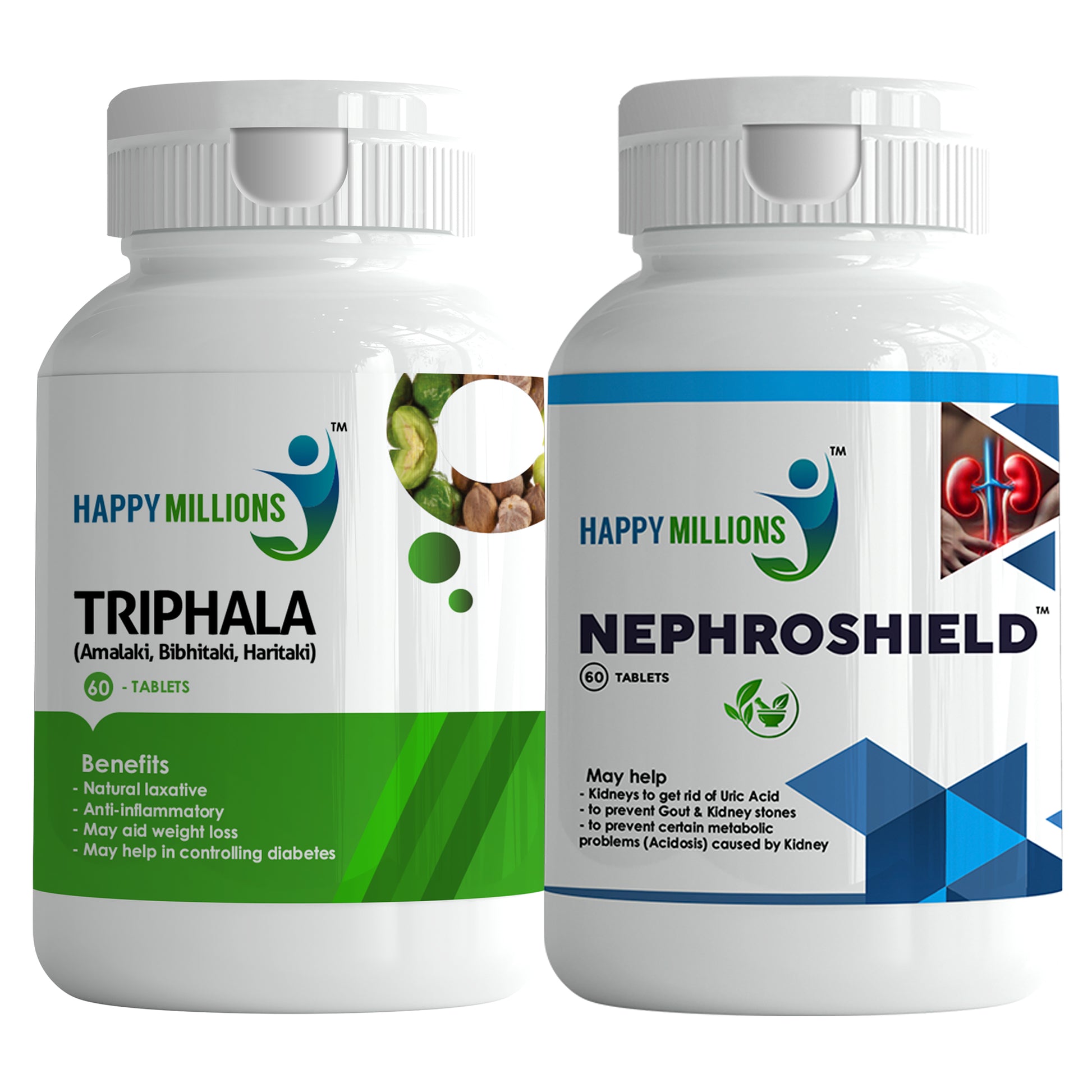 HappyMillions Triphala & Nephroshield 60 Tablets Combo | Ayurvedic Digestive Support & Kidney Health Supplement | Natural Detox & Cleansing Formula
